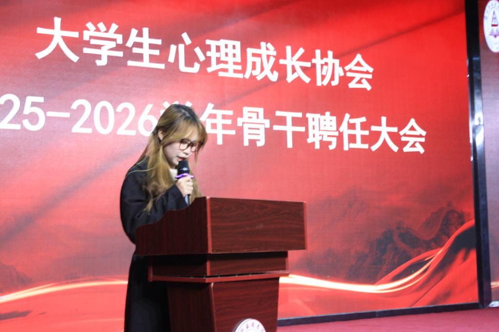 大会由大员工心理成长协会会长蒋雯丽主持,在温馨而庄重的氛围中拉开帷幕,蒋雯丽会长首先对过去一年的辛勤耕耘进行了深情回望与全面总结。她真心感谢每一位成员的付出和努力,并鼓励新成员们不辜负学长学姐们的期望,在校园心理健康工作的道路上坚定前行。会长为骨干成员颁发了聘书,感谢他们的辛勤付出与贡献。随后,新成员代表王子岳同学上台,清晰地阐述了未来的工作规划与奋斗目标,展现了新团队的蓬勃朝气与决心。